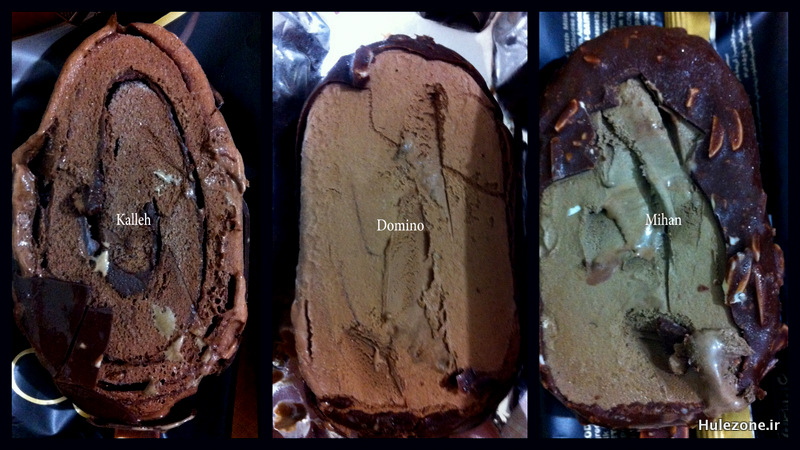شکلات داخلی دومینو همچنان شیرینه و یه طعم شیر و اون طعمی که نمیدونم چیه، ولی تو اکثر بستنیهای بستنیفروشیایی که اسکوپی بستنی میفروشن هست، همراهشه(نوبل ادبیات رو بدین برم، کار دارم – کپیرایت آلتیما!). میهن تلختره و طعم خوشایندتری نسبت به دومینو(حداقل برای من) داره. کاله هم همچنان طعم شکلات خیلی زیادی داره و تلختره. البته کاله به واسطهی همون شکل رولتی و دورنگی که گفتم، یه جاهاییش یه تیکه شکلاتهای شیرینتری هم قاطیش داره که تلخی شکلات اصلی رو کمی پوشش میده و یه جاهاییش به شیرینی میزنه (البته نه به اندازه دومینو). شکلات کاله انگار سنگینتره، از این لحاظ که با خوردنش یه حس سیرشدن میده به آدم، ولی اون دوتای دیگه اینجوری نیستن. تو چند دقیقهای هم که از فریزر بیرون بود، کاله بیشتر از میهن، و میهن بیشتر از دومینو آب شد