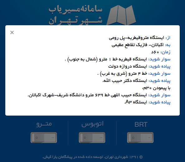 مسیریاب تهران، یه نرمافزار iOS، Android و وبه که شما بهش مبدا و مقصد میدین، بهتون زمان لازم و مسیر رو با استفاده از خطوط مترو، اتوبوس و BRT میگه. دیگه چی میخواین؟